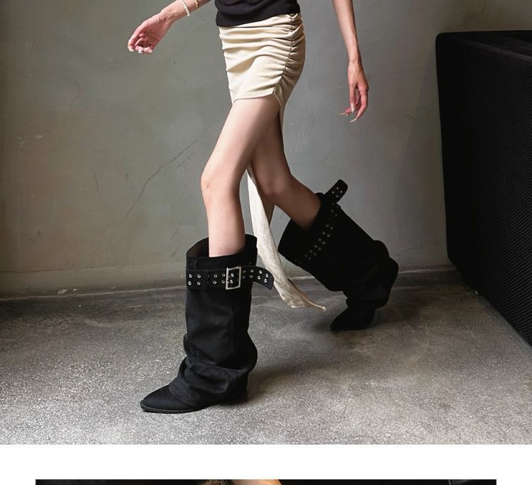 Black Knee-High Pointed-Toe High-Heel Western Boots