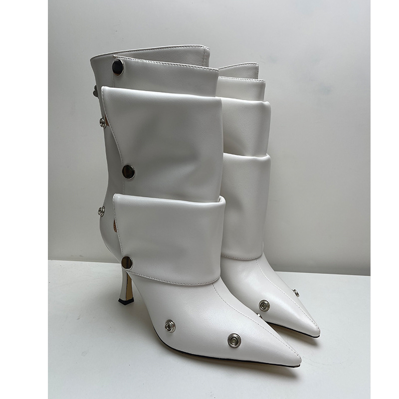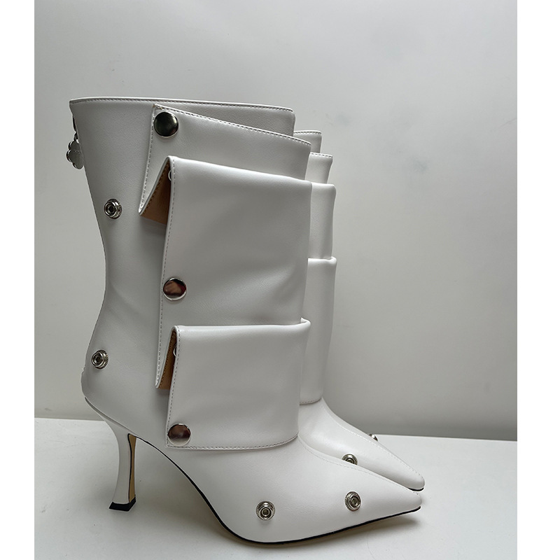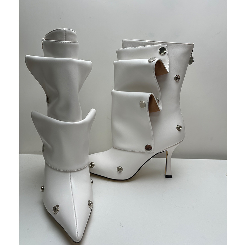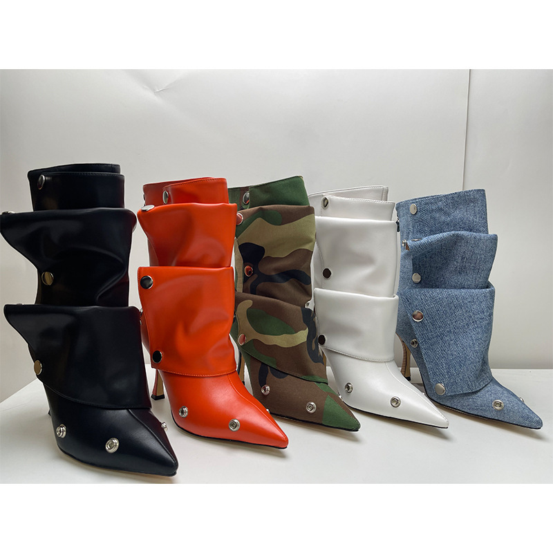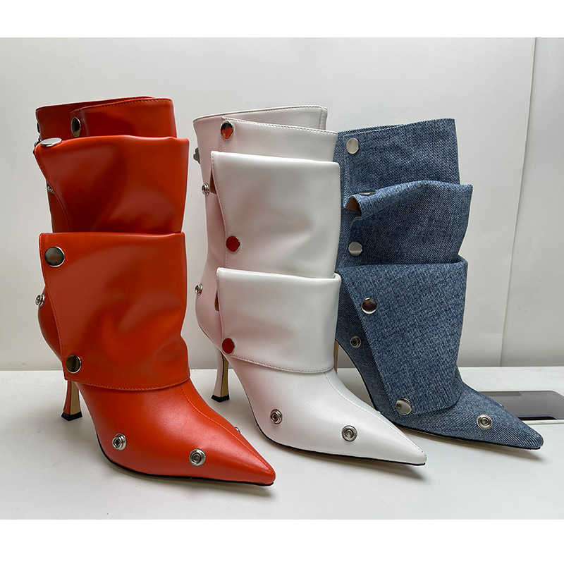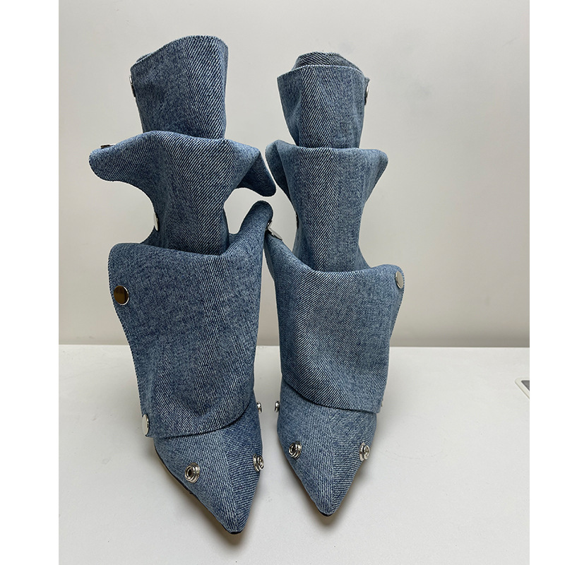 High-heeled Pointed-toe Denim Patchwork Ankle Boots With Metal Studs